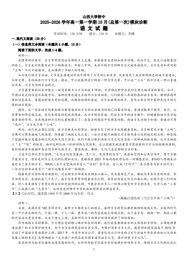 山大附中2025-2026学年第一学期高一年级10月模块诊断 语文.pdf