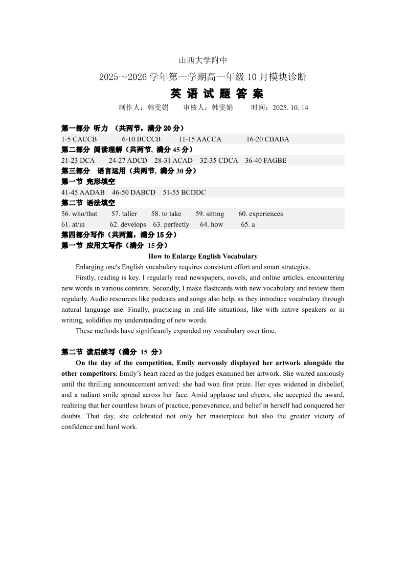 山大附中2025-2026学年第一学期高一年级10月模块诊断 英语答案.pdf
