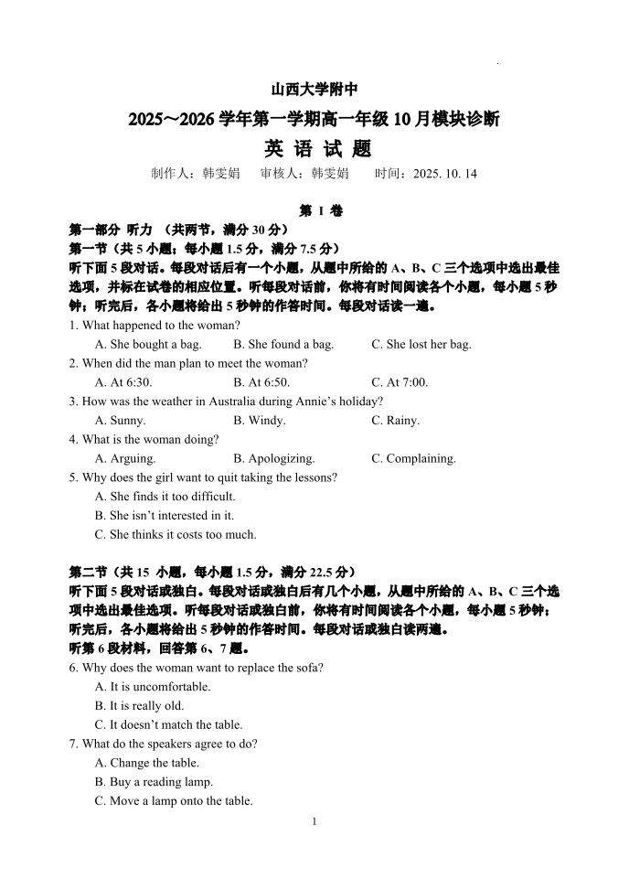 山大附中2025-2026学年第一学期高一年级10月模块诊断 英语.pdf