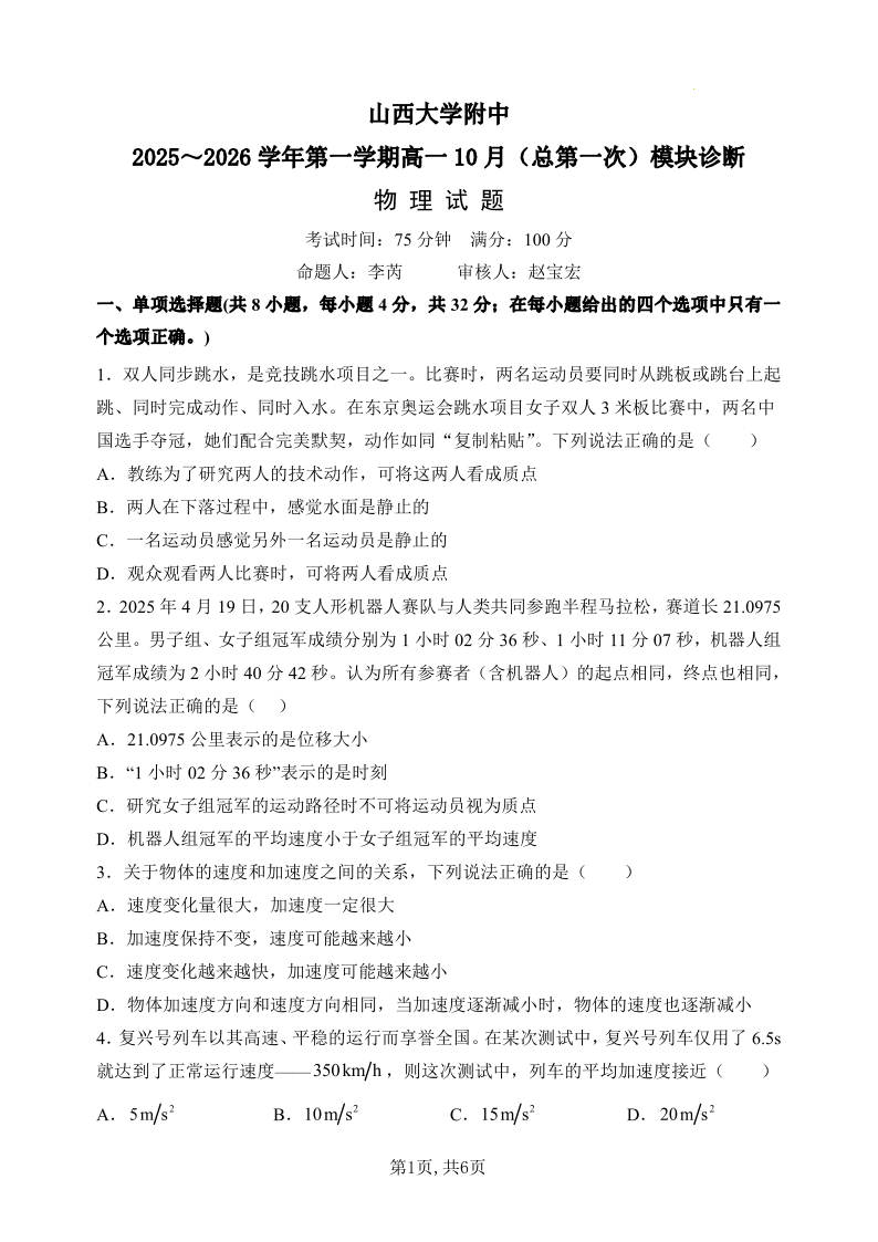 山大附中2025-2026学年第一学期高一年级10月模块诊断 物理.pdf