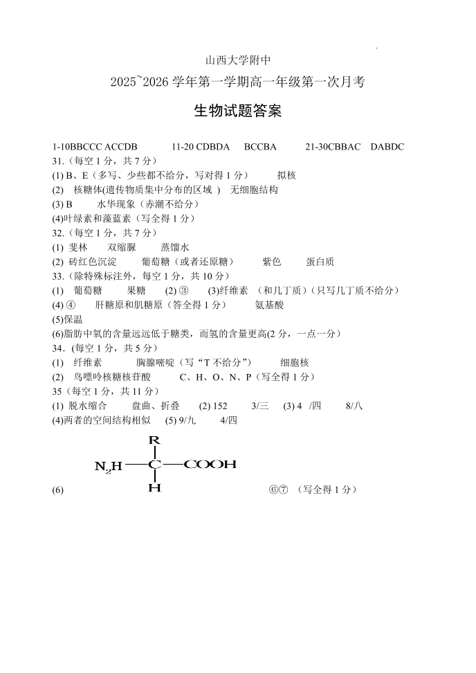 山大附中2025-2026学年第一学期高一年级10月模块诊断 生物答案.pdf
