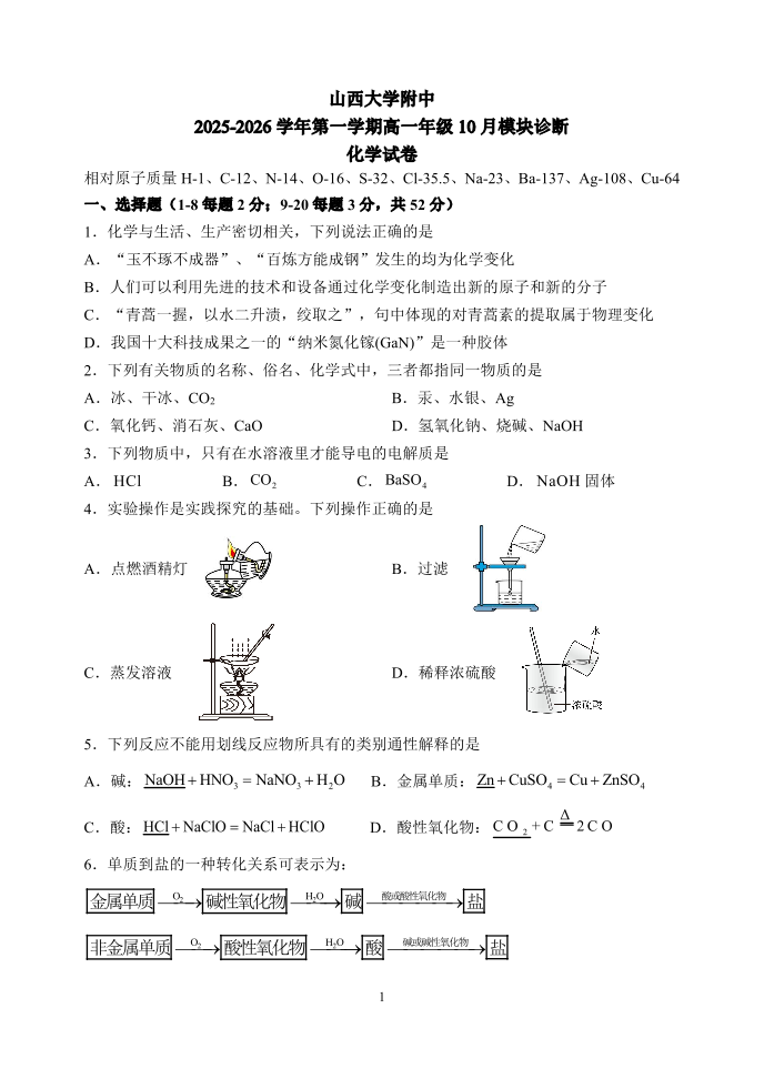 山大附中2025-2026学年第一学期高一年级10月模块诊断 化学.pdf