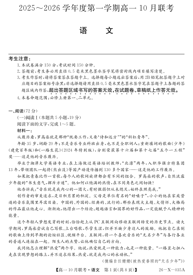 安徽省县中联盟2025~2026学年度第一学期高一10月联考 语文.pdf