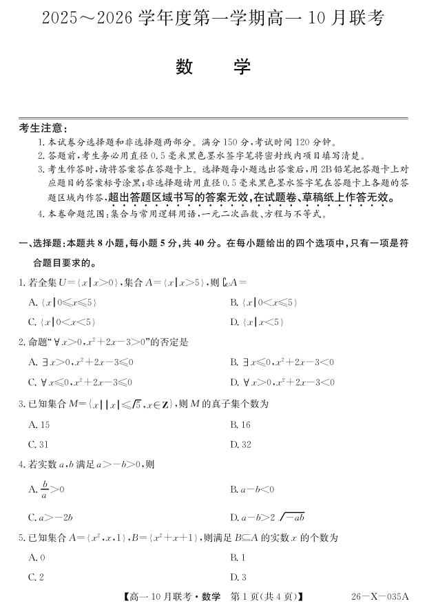 安徽省县中联盟2025~2026学年度第一学期高一10月联考 数学.pdf