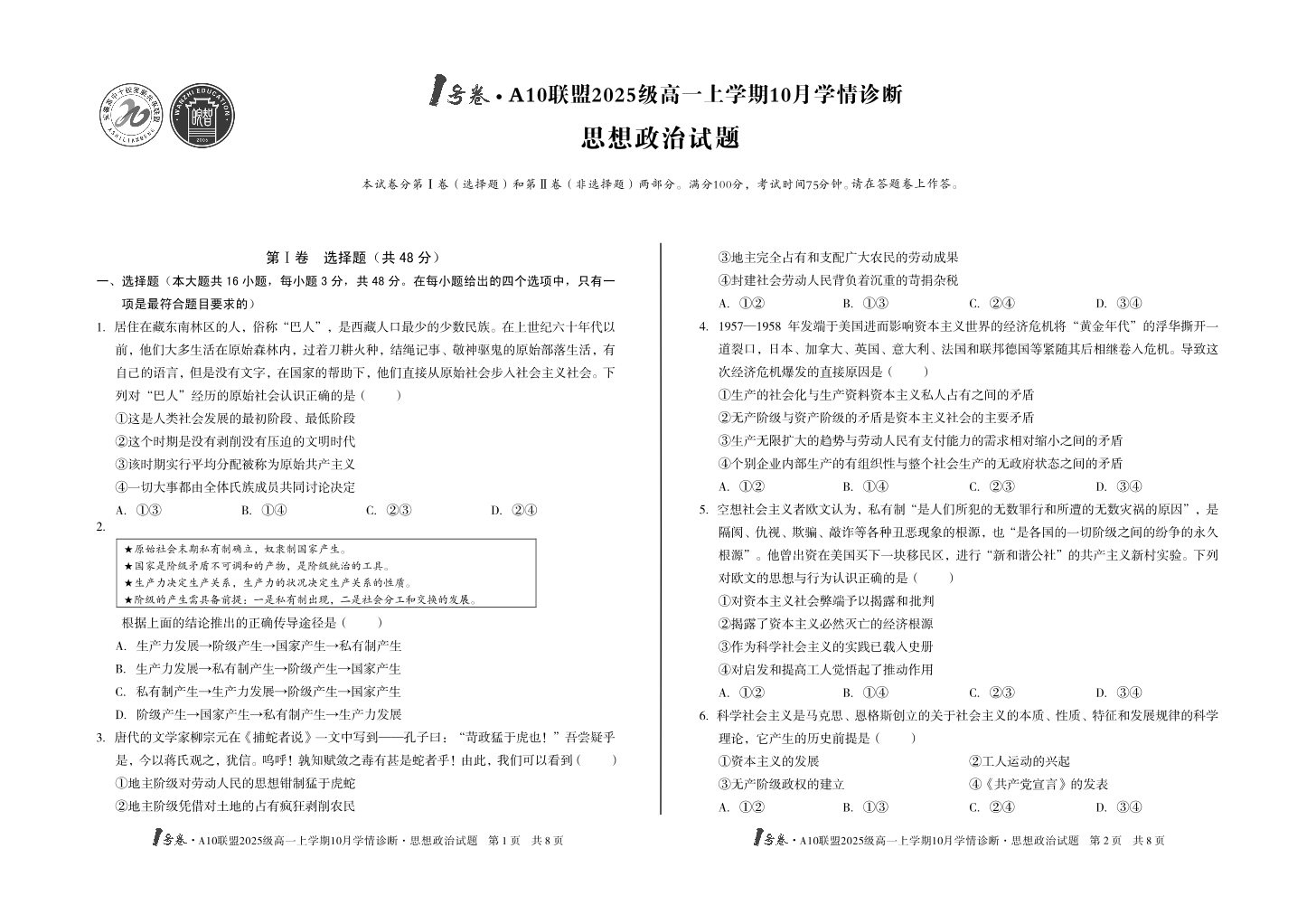 1号卷·A10联盟2025级高一上学期10月学情诊断 政治.pdf