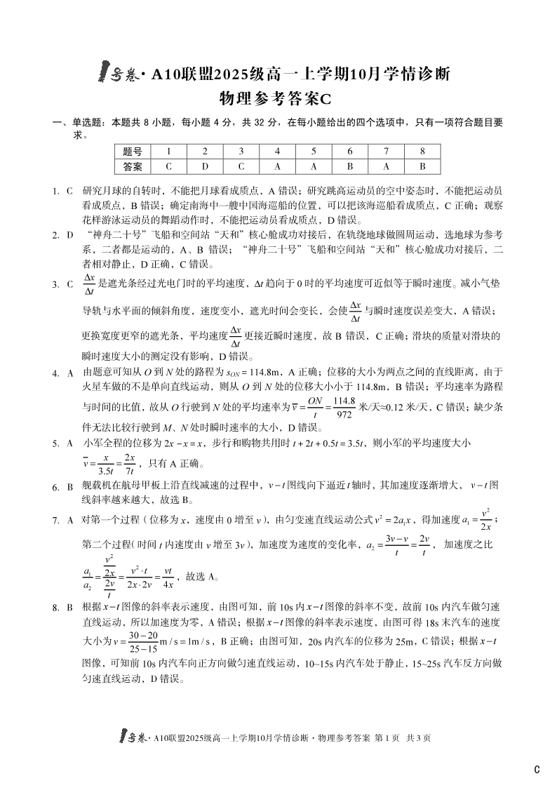 1号卷·A10联盟2025级高一上学期10月学情诊断 物理C答案.pdf