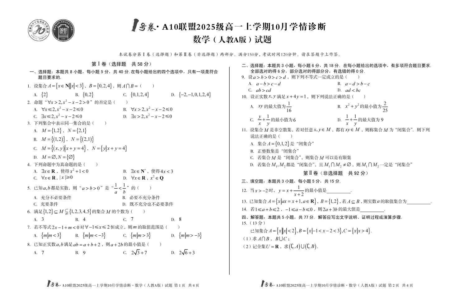 1号卷·A10联盟2025级高一上学期10月学情诊断 数学(人教A版).pdf