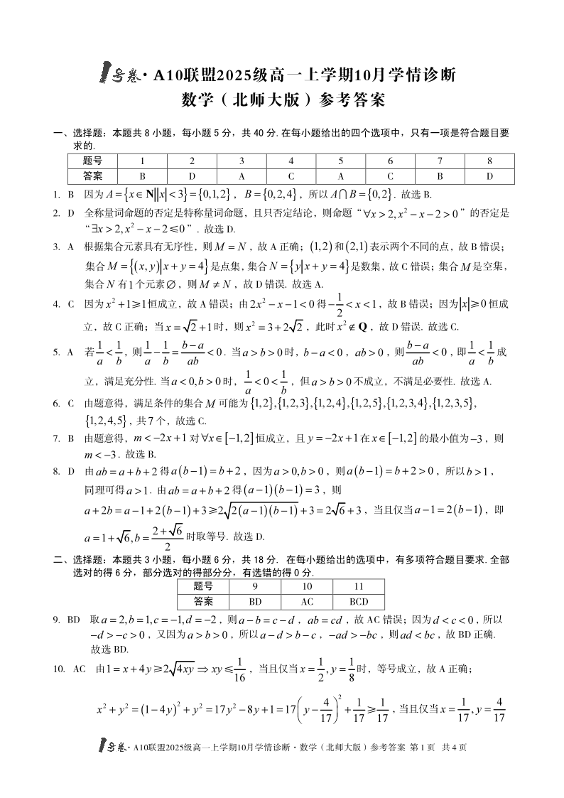 1号卷·A10联盟2025级高一上学期10月学情诊断 数学(北师大版)答案.pdf