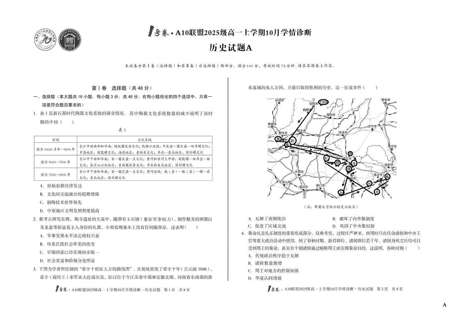 1号卷·A10联盟2025级高一上学期10月学情诊断 历史A.pdf