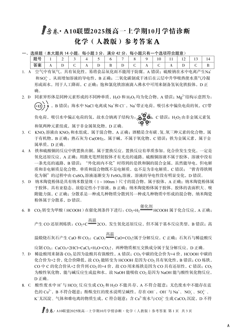 1号卷·A10联盟2025级高一上学期10月学情诊断 化学(人教版)B答案.pdf