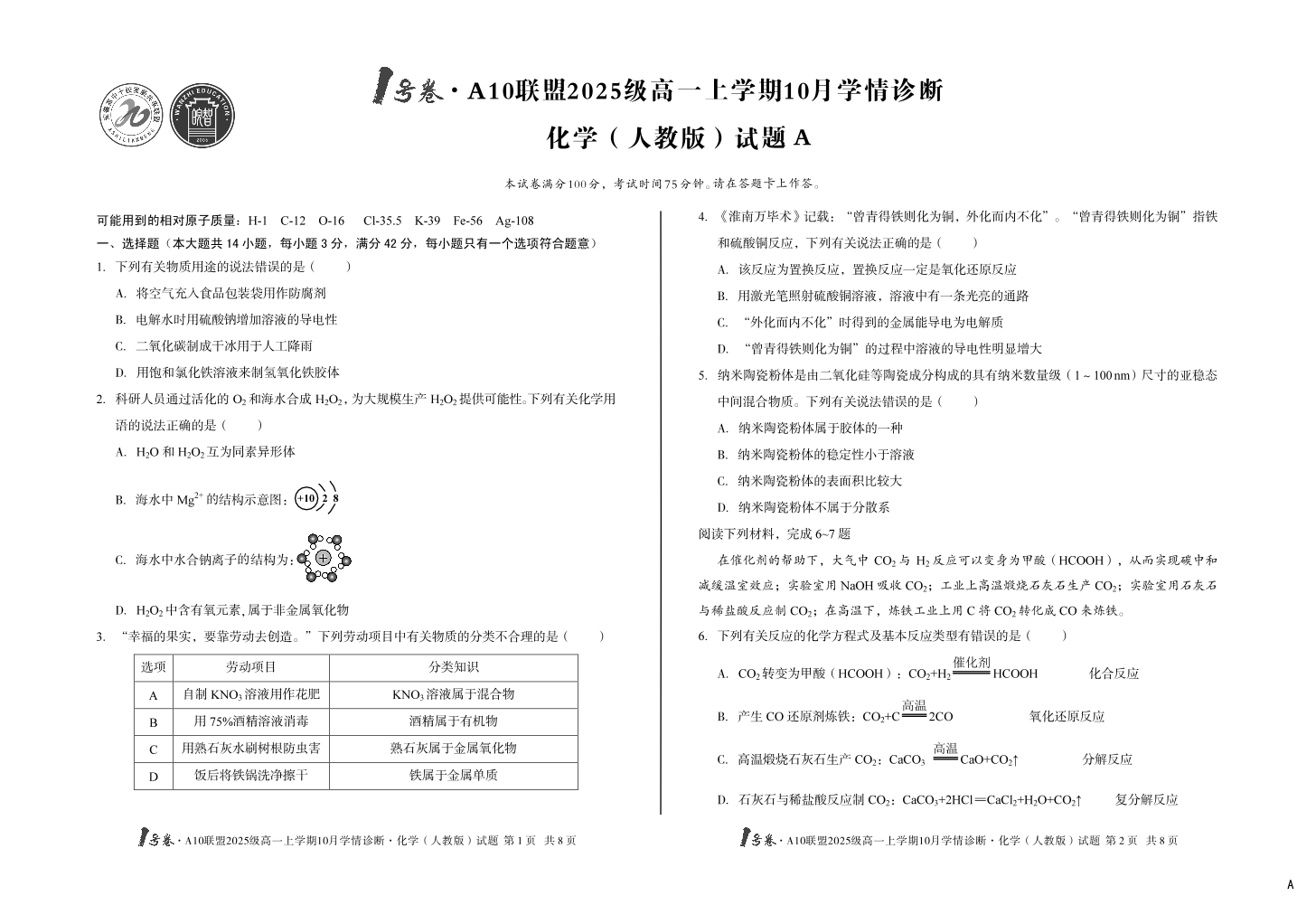 1号卷·A10联盟2025级高一上学期10月学情诊断 化学(人教版)A.pdf