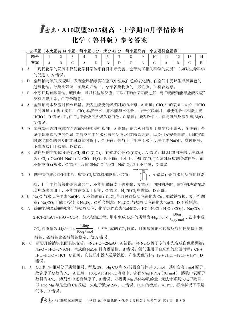 1号卷·A10联盟2025级高一上学期10月学情诊断 化学(鲁科版)答案.pdf