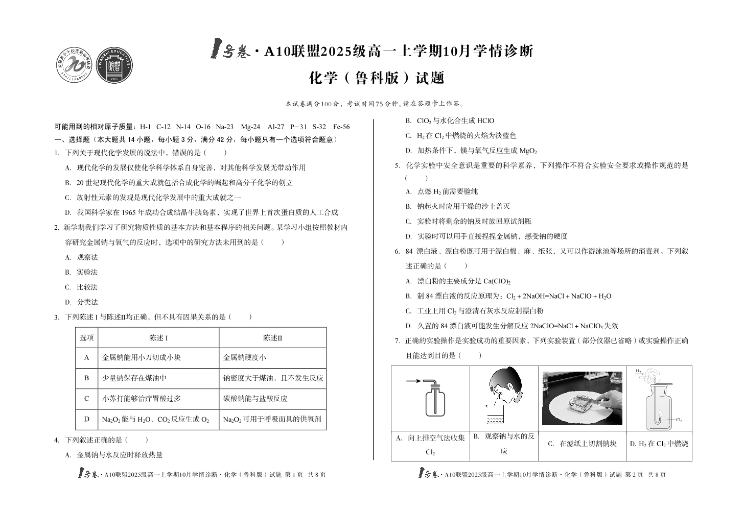 1号卷·A10联盟2025级高一上学期10月学情诊断 化学(鲁科版).pdf