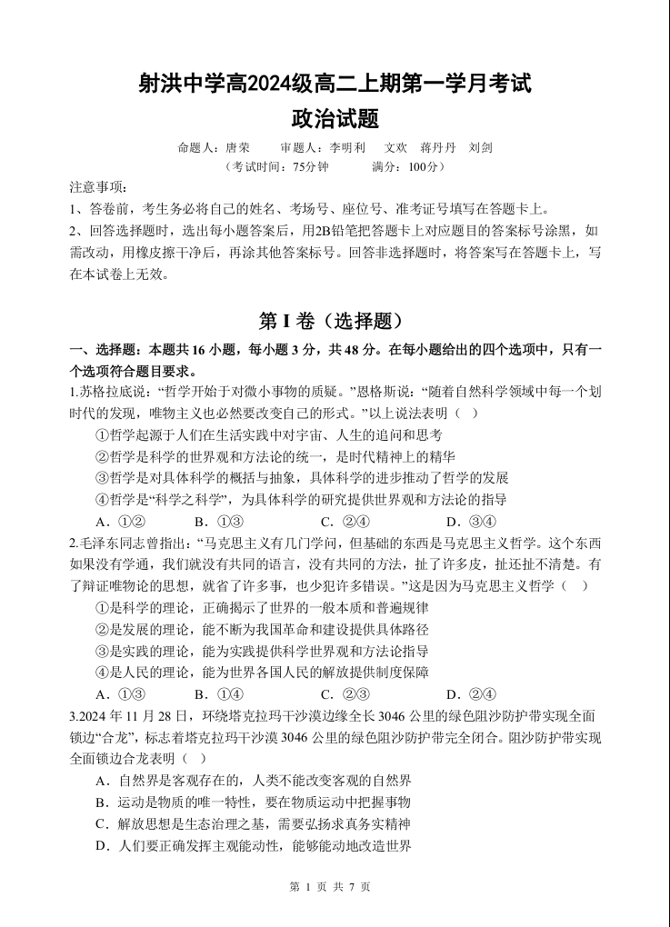 四川省遂宁市射洪中学2025-2026学年高二上学期10月月考 政治.docx