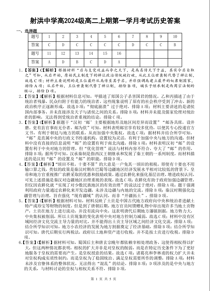 四川省遂宁市射洪中学2025-2026学年高二上学期10月月考 历史答案.docx