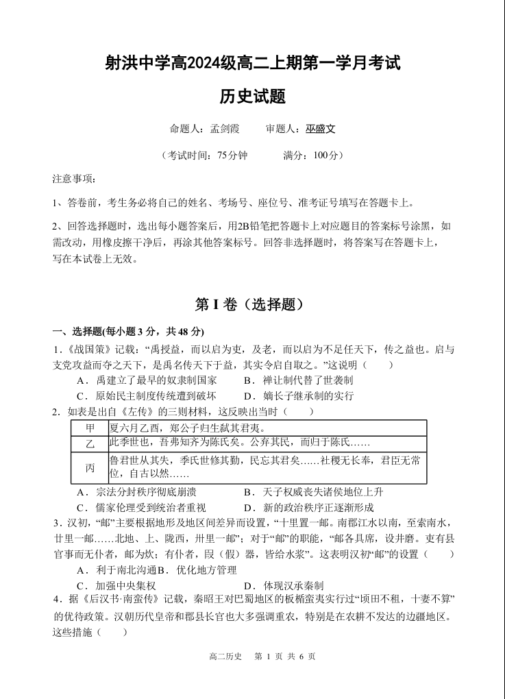 四川省遂宁市射洪中学2025-2026学年高二上学期10月月考 历史.docx
