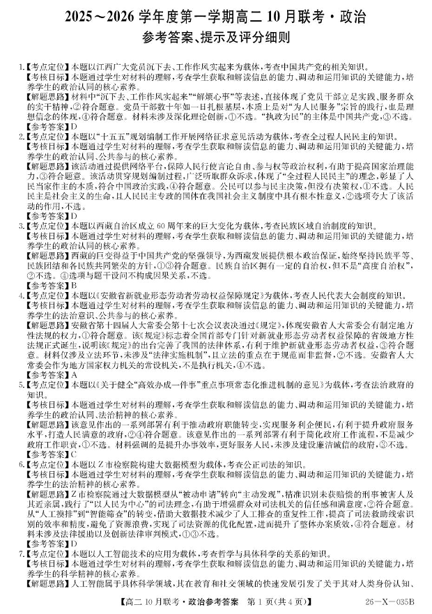 安徽省县中联盟2025-2026学年高二上学期10月月考 政治答案.pdf