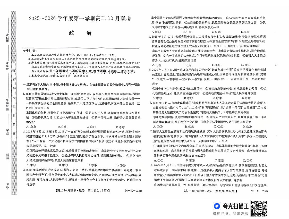 安徽省县中联盟2025-2026学年高二上学期10月月考 政治.pdf