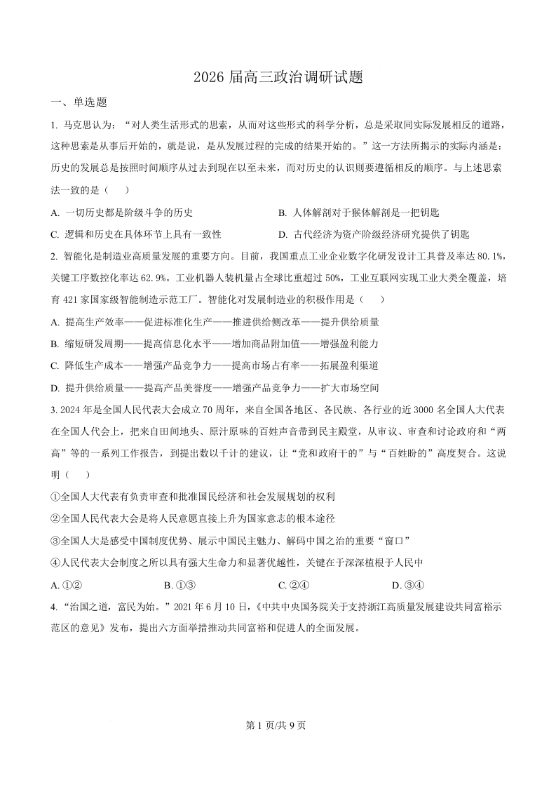 江苏省南京市金陵中学2026届高三上学期10月月考 政治.docx