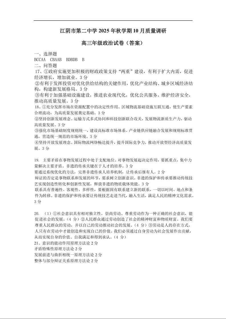江苏省无锡市三校2025年秋学期10月质量调研 政治答案.docx