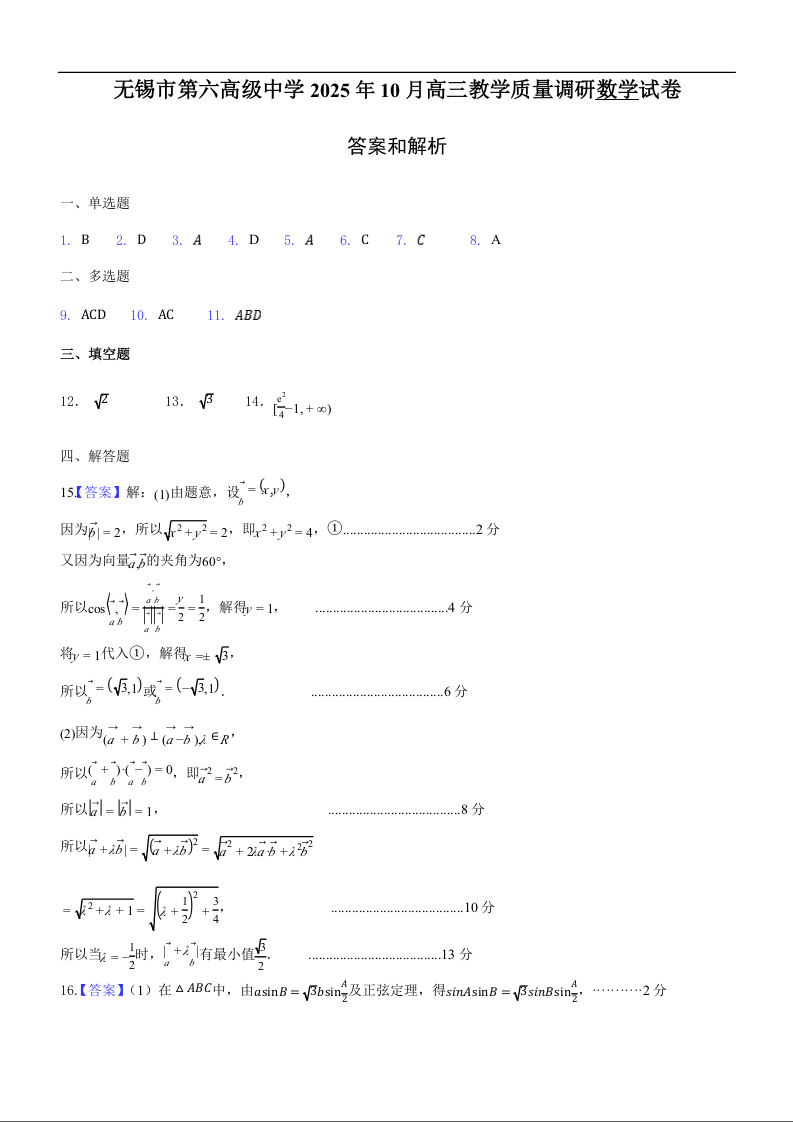 江苏省无锡市三校2025年秋学期10月质量调研 数学答案.docx