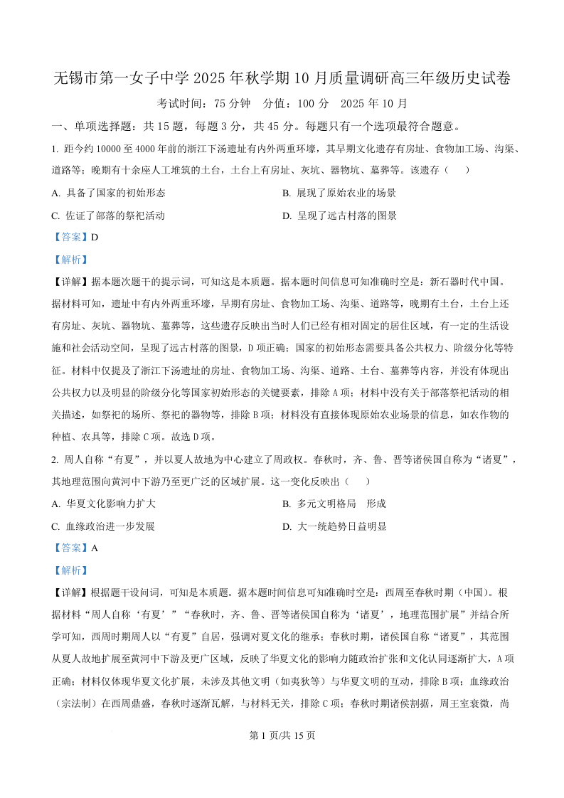 江苏省无锡市三校2025年秋学期10月质量调研 历史答案.docx