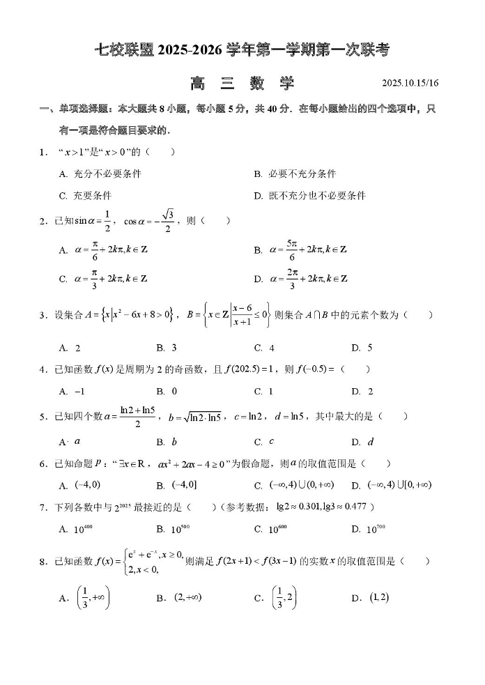 江苏省扬州市七校联盟2026届高三上学期第一次联考 数学试题(含答案).pdf