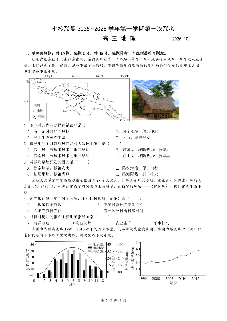 江苏省扬州市七校联盟2026届高三上学期第一次联考 地理试题(含答案).pdf
