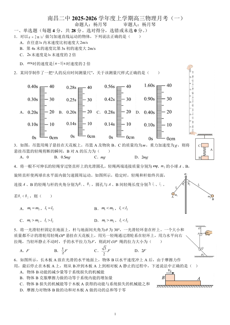江西省南昌市第二中学2026届高三上学期月考(一)物理试题(含答案).docx