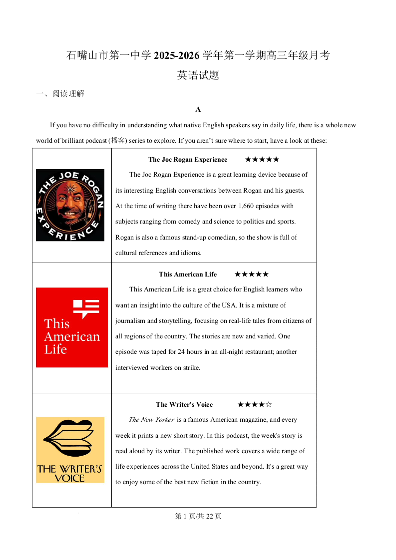 宁夏石嘴山市第一中学2026届高三上学期10月月考 英语答案.docx