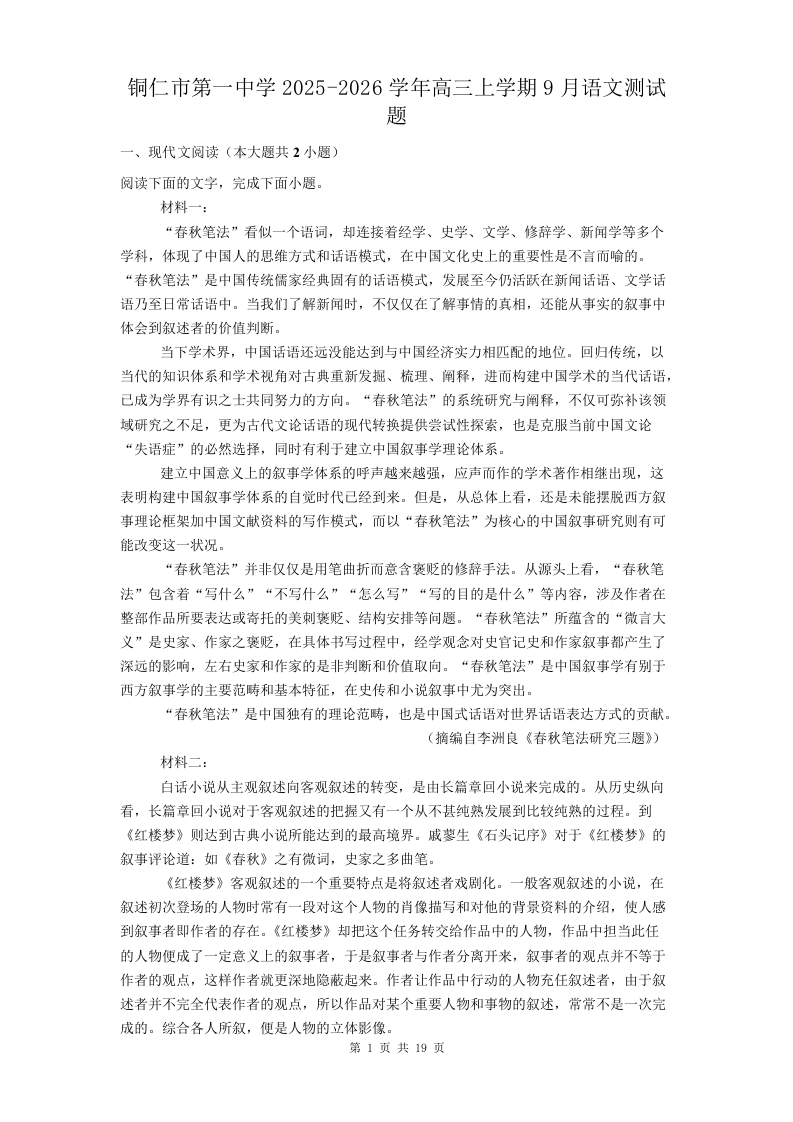 贵州省铜仁第一中学2026届高三上学期10月月考 语文试题(含答案).docx