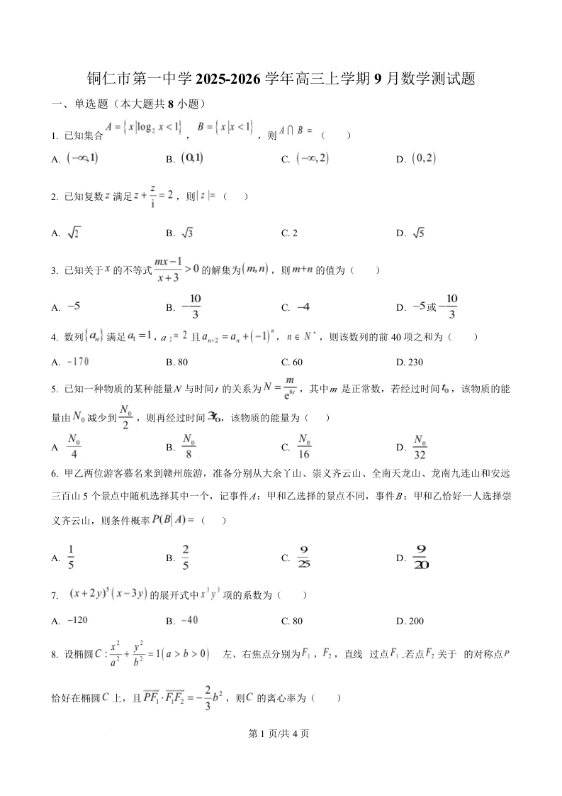 贵州省铜仁第一中学2026届高三上学期10月月考 数学.docx