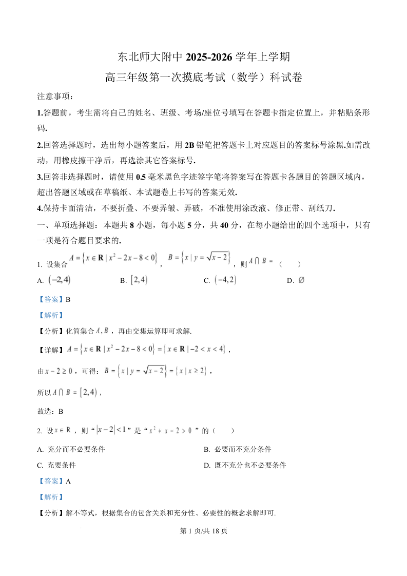 吉林省东北师范大学附属中学2026届高三上学期第一次摸底考试 数学答案.docx