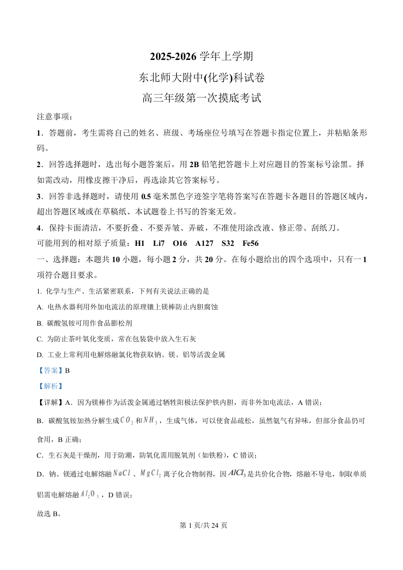 吉林省东北师范大学附属中学2026届高三上学期第一次摸底考试 化学答案.docx