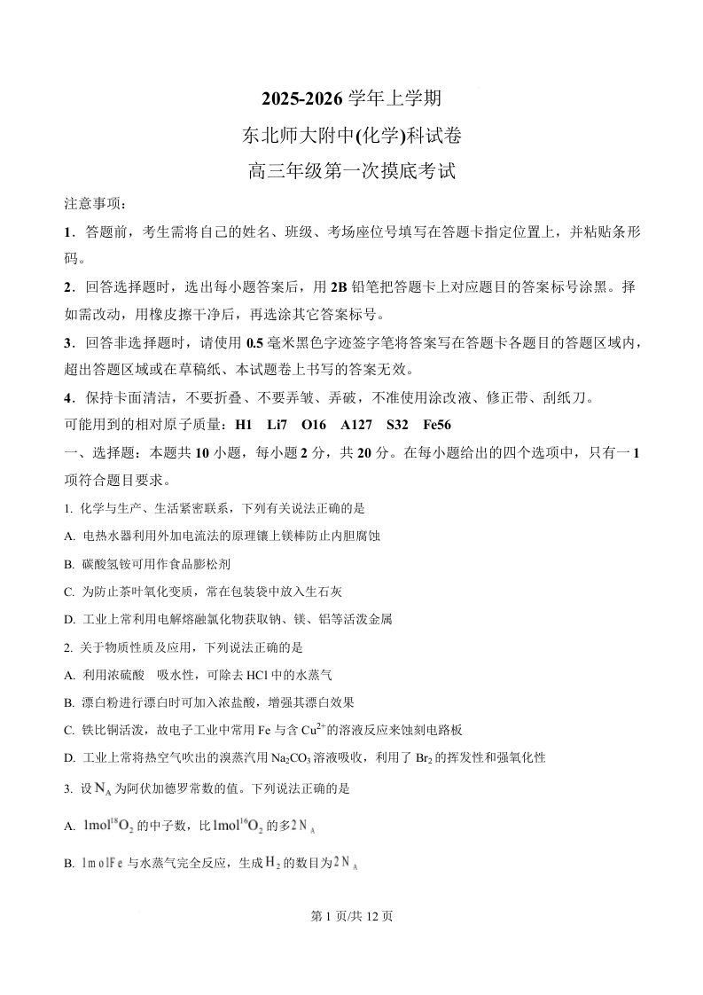 吉林省东北师范大学附属中学2026届高三上学期第一次摸底考试 化学.docx