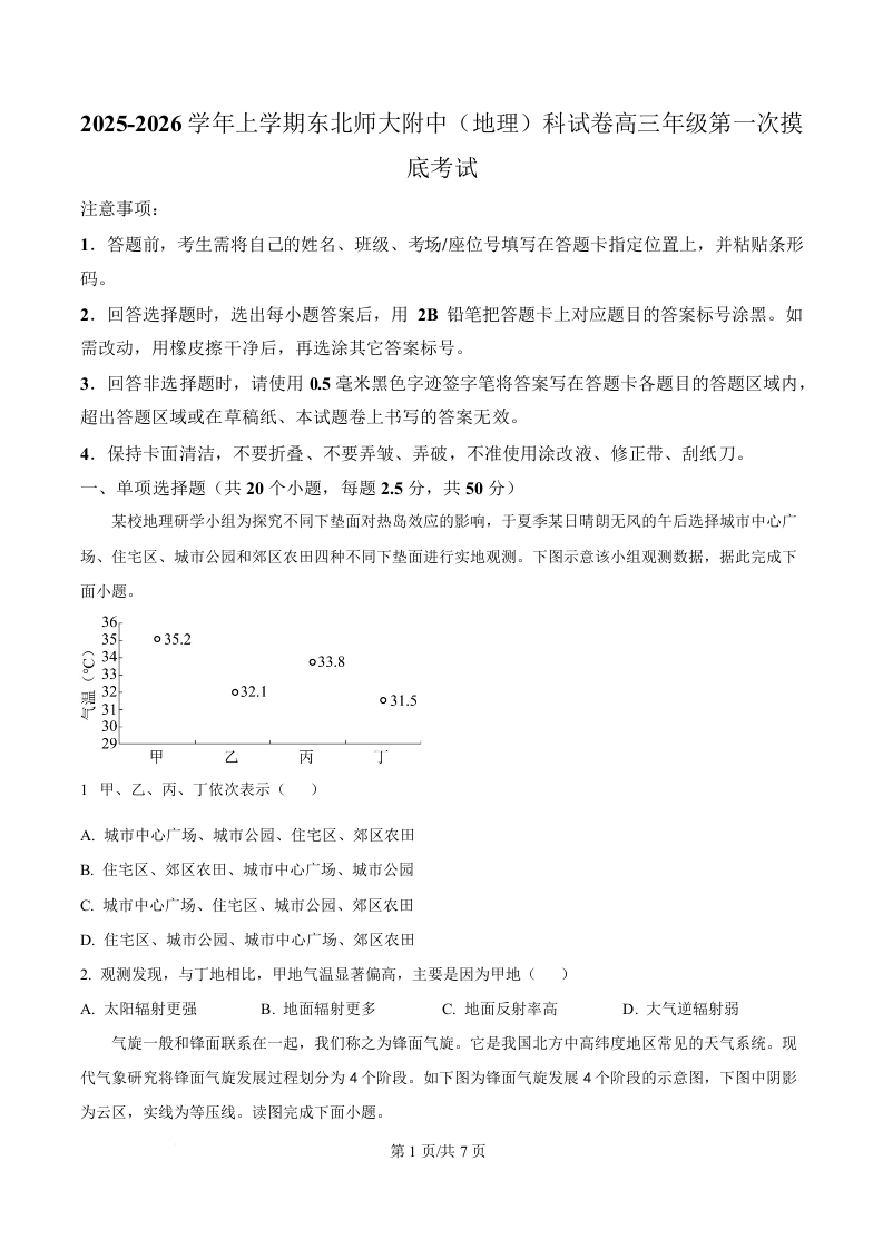 吉林省东北师范大学附属中学2026届高三上学期第一次摸底考试 地理.docx