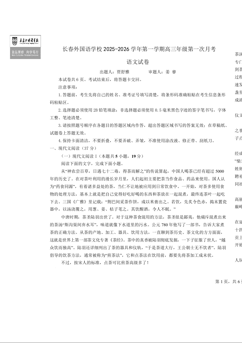 吉林省长春外国语学校2026届高三上学期10月月考 语文试题(含答案).docx