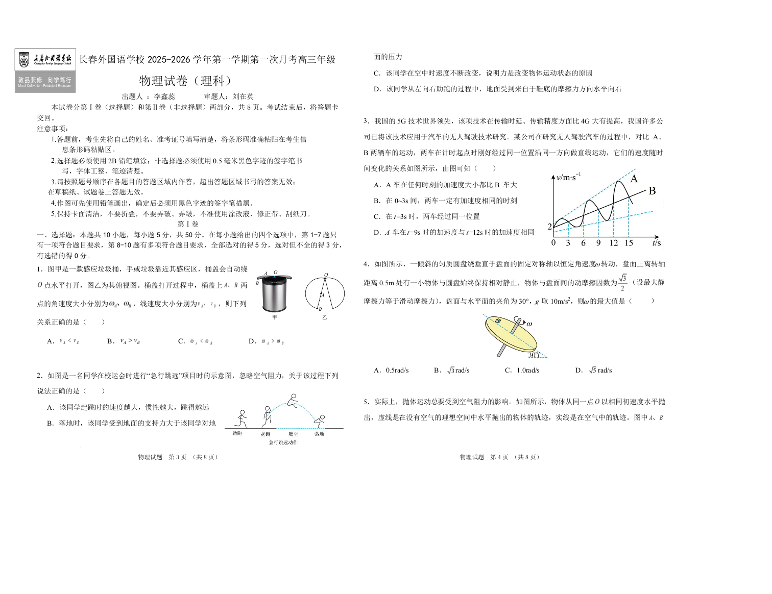吉林省长春外国语学校2026届高三上学期10月月考 物理试题(含答案).docx