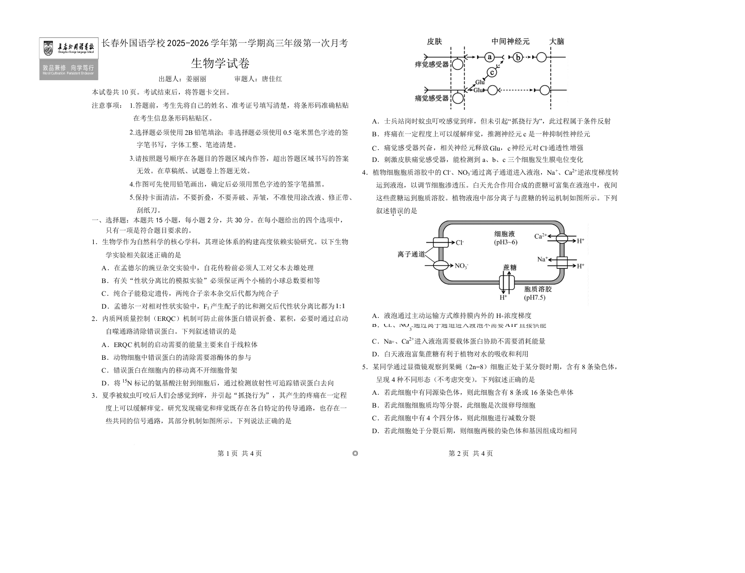 吉林省长春外国语学校2026届高三上学期10月月考 生物试题(含答案).docx