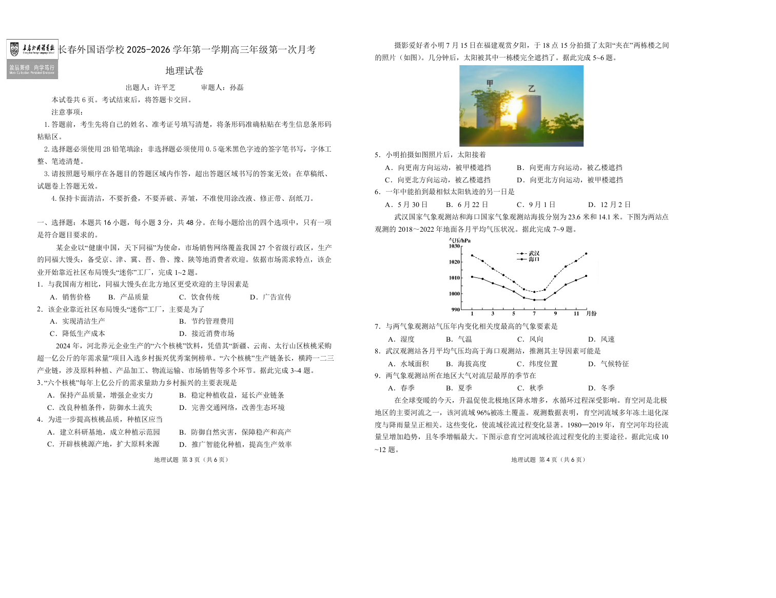 吉林省长春外国语学校2026届高三上学期10月月考 地理试题(含答案).docx