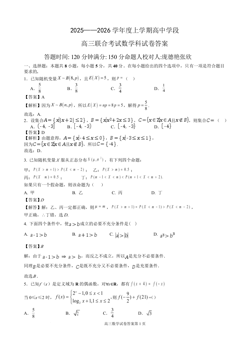 2025-2026学年度上学期高中学段高三联合考试 数学答案.docx