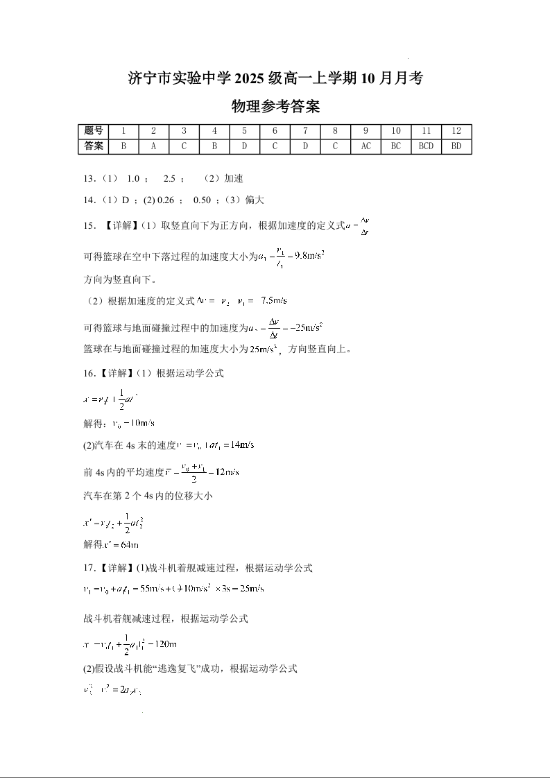 山东省济宁市实验中学2025-2026学年高一上学期10月月考 物理答案.docx