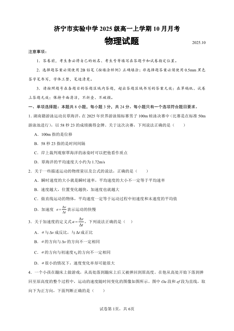 山东省济宁市实验中学2025-2026学年高一上学期10月月考 物理.pdf