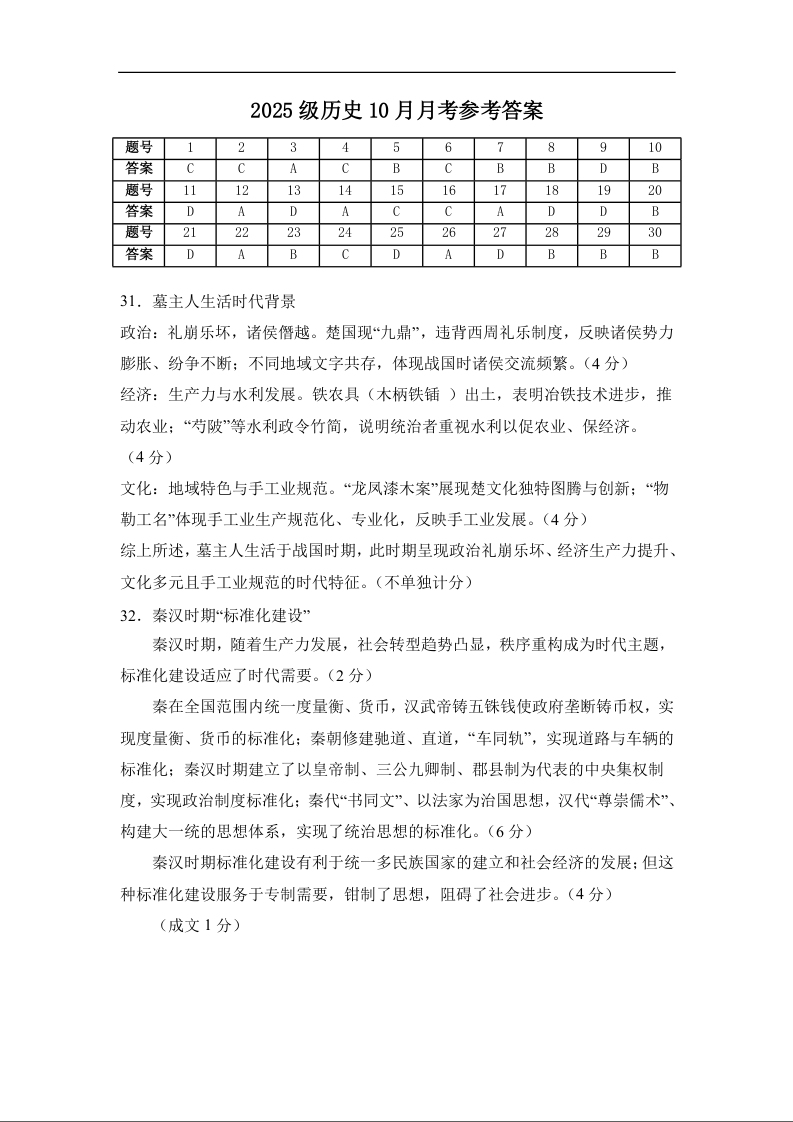 山东省济宁市实验中学2025-2026学年高一上学期10月月考 历史答案.docx