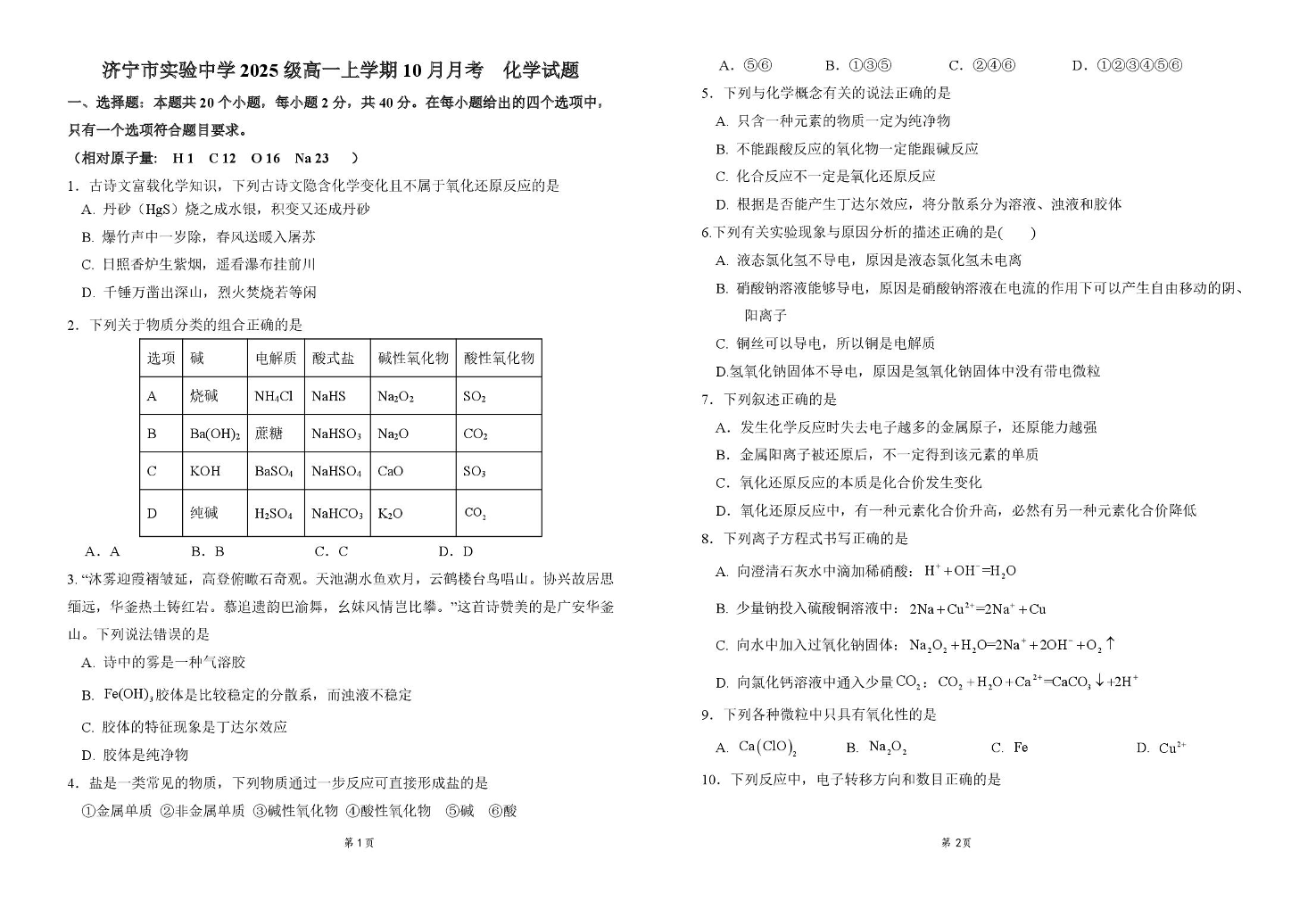 山东省济宁市实验中学2025-2026学年高一上学期10月月考 化学.pdf