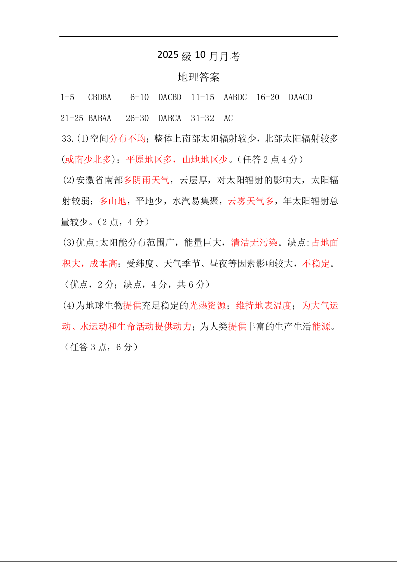山东省济宁市实验中学2025-2026学年高一上学期10月月考 地理答案.docx