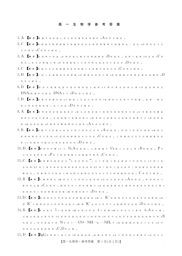 广东省2028届高一年级10月份联考 生物答案.pdf