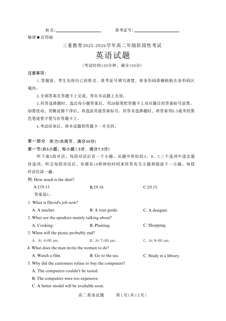山西省三重教育2025-2026学年高二年级10月阶段性考试 英语.pdf