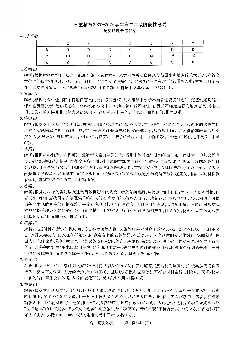 山西省三重教育2025-2026学年高二年级10月阶段性考试 历史答案.pdf