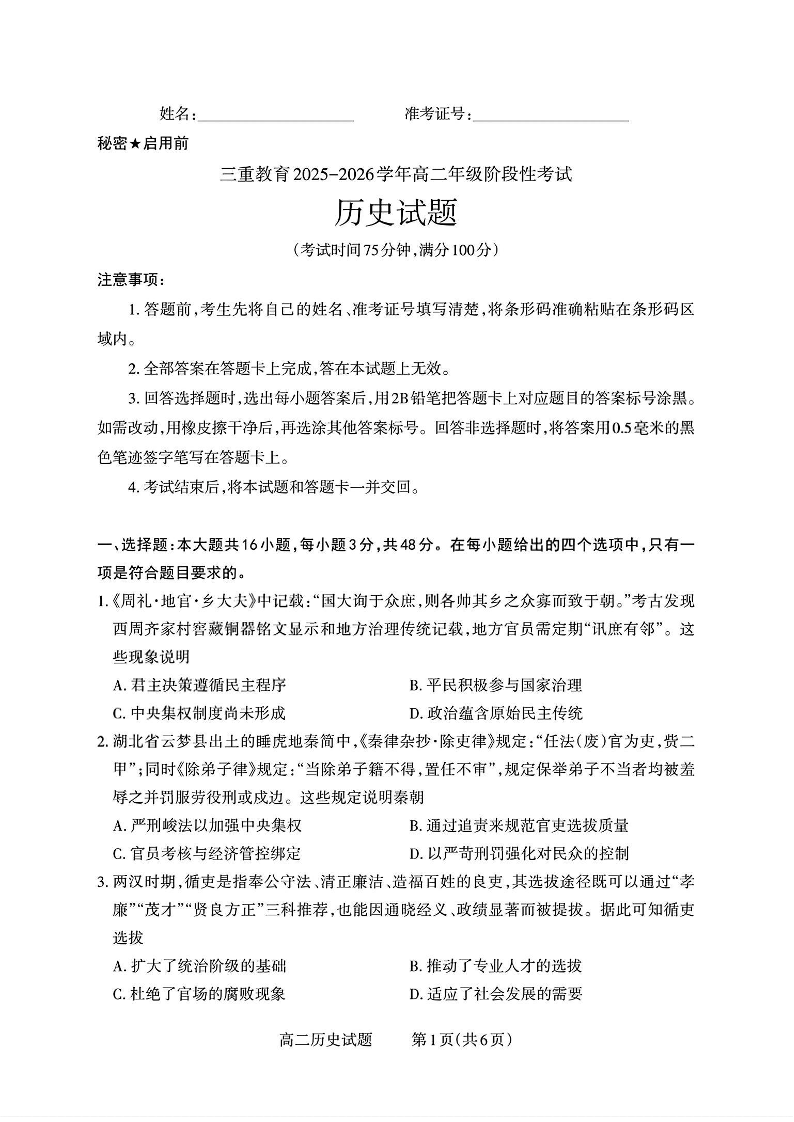 山西省三重教育2025-2026学年高二年级10月阶段性考试 历史.pdf